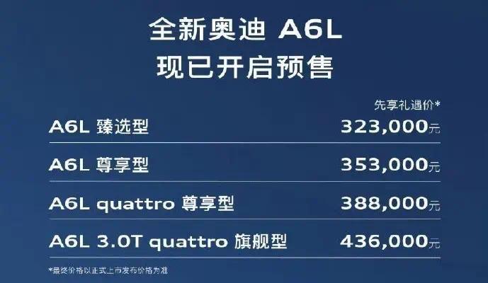 3月10日,奥迪官方宣布全新奥迪A6L开启预售,此次新车共推出4款车型,先享礼遇价为32.3万-43.6万元,同时还推出限时四重预售好礼,相比于过去几代车型此次全新奥迪A6L的预售可以说是相当低调,同时相比于上代车型42.79万元的起售价格,此次先享礼遇价可以说是下探了10.8万,同时新车基于PPC豪华燃油车平台生产,在外观设计、车身尺寸、智能座舱、驾驶辅助以及动力总成等多个维度均进行了升级。据悉,新车预计将于3月内正式上市。