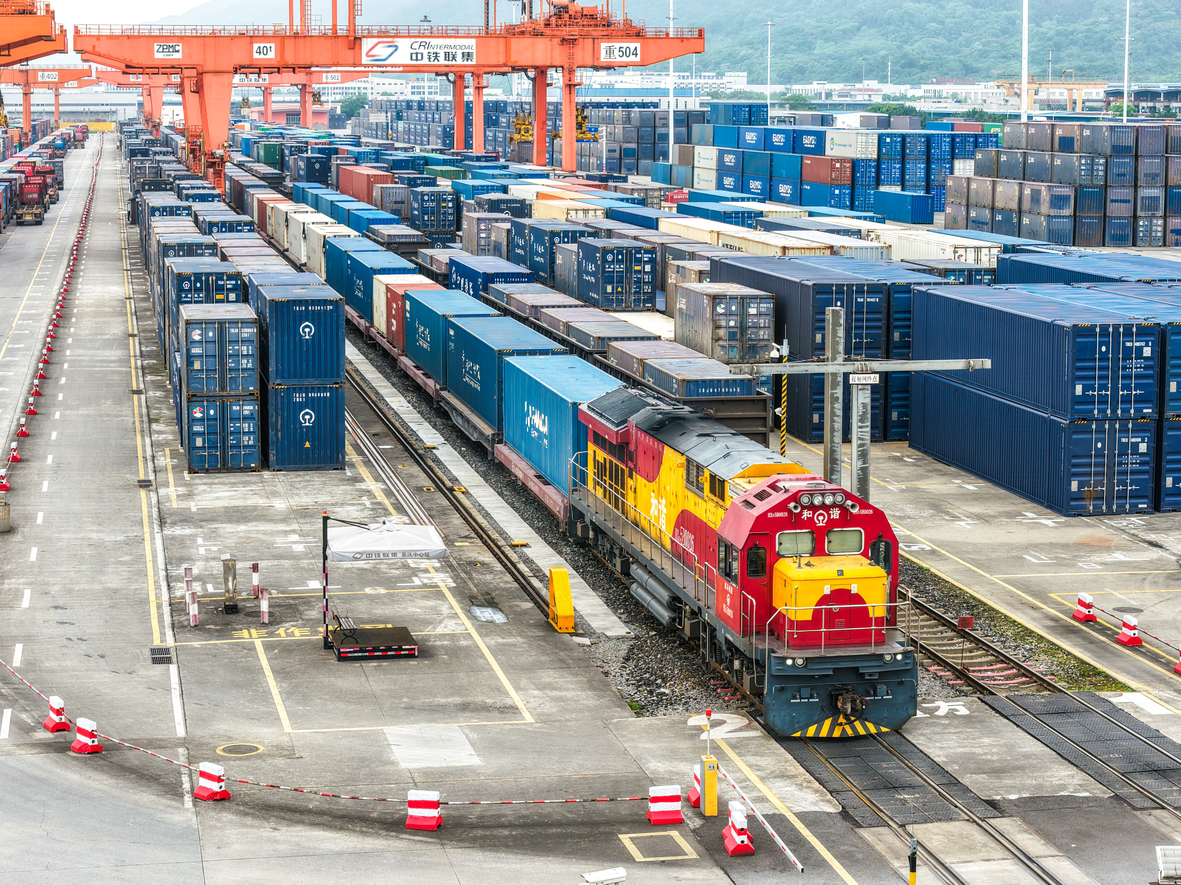 4月15日,一列满载“重庆造”新能源汽车的中老跨境班列在重庆团结村站等待发车(无人机照片)。