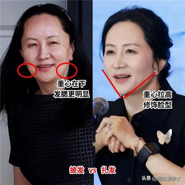 另外,中年女人很多都会遇到发腮的问题,如果这个时候你还披头散发,不一定能显得脸小,反倒是有可能会导致重心下移,导致发腮的问题变得更加明显,再看扎发,能够一定程度把我们的视觉重心拉高,显得下巴更尖,脸型更流畅。