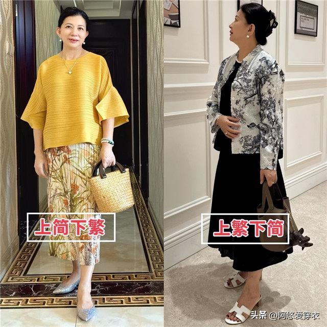 穿长裙的时候,中年女人也别让全身搭配得太单调或者太花哨,比如穿纯色的长裙会有点沉闷,试着搭配一件有设计感的上衣中和一下,穿花裙的时候若是太杂乱,可以配一件纯色的上衣减少繁琐感,用这种简繁结合的思路能凸显出搭配的重点,看着更和谐。